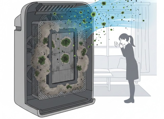 特に恐ろしいのは、一度機内で繁殖したカビが、ファンによる強力な送風に乗って部屋中に撒き散らされる現象です。フィルターに根を張ったカビの胞子は、スイッチを入れた瞬間に目に見えない霧のように室内に充満します。アレルギーを抱える方にとって、この「濃縮された汚染物質」を直接吸い込むことは、通常の室内環境にいるよりもはるかに強い刺激となります。これが、空気清浄機をつけているのに鼻炎や咳が止まらないという「逆効果」の正体なのです。
