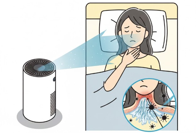 空気清浄機のフィルターを通過した風は、微細な塵や湿気を吸着・除去する過程で非常に乾燥した状態になっています。この「超乾燥した風」が、就寝中の顔や喉に直接当たり続けると、粘膜の水分が急速に奪われてしまいます。