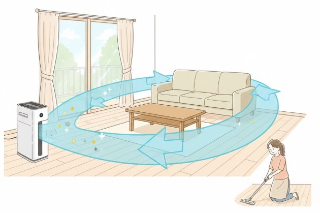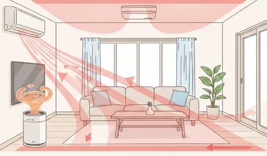 逆に冬場の暖房時は、暖かい空気が上に昇るため、エアコンの真下付近に清浄機を配置するのがおすすめ。上昇気流に乗って舞い上がったホコリを、効率よくキャッチできる構成になります。こうした「気流のシナジー」を意識するだけで、清浄速度は格段に変わりますよ。