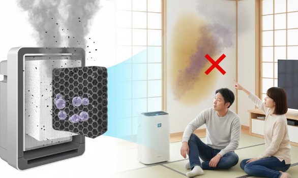 「タバコの煙を何とかしたい」というニーズに対して、空気清浄機は半分正解で半分不正解です。まず、煙に含まれる微細な粒子(タールなど)はHEPAフィルターで吸い取ることができます。しかし、タバコの強烈な「匂い(ガス成分)」に対しては、活性炭フィルターによる吸着が必要になります。問題は、タバコの匂い成分は非常に強力で、一般的な薄い脱臭フィルターだとすぐに「飽和状態(お腹いっぱい)」になってしまうことです。