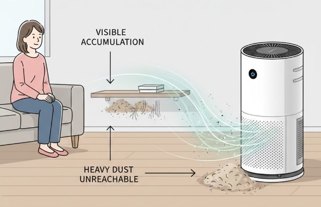 床に堆積したホコリは、人が歩いたり、ドアを開閉したりして空気が大きく動かない限り舞い上がりません。空気清浄機はその舞い上がった瞬間のわずかなチャンスにしか機能しないため、結果として「棚の上のホコリは相変わらず溜まったまま」という状況になり、期待外れという評価を下すことになります。