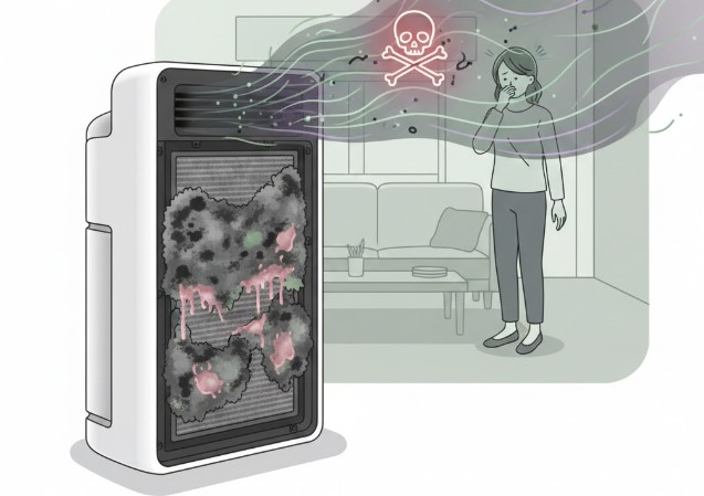 空気清浄機は「室内の汚れを一箇所に集めるゴミ箱」のような側面を持っています。この認識が欠けていると、非常に危険な事態を招きます。集じんフィルターに吸着されたホコリやカビの胞子は、湿気などの条件が整えば内部で繁殖を始めます。特に、梅雨時や加湿機能を使っている時期にメンテナンスを怠ると、空気清浄機自体が「カビの散布機」へと変貌してしまうのです。数ヶ月ぶりにスイッチを入れた際、吹き出し口から生臭いニオイや酸っぱいニオイが漂ってきた経験はありませんか?それは内部で雑菌が爆発的に増えているサインです。