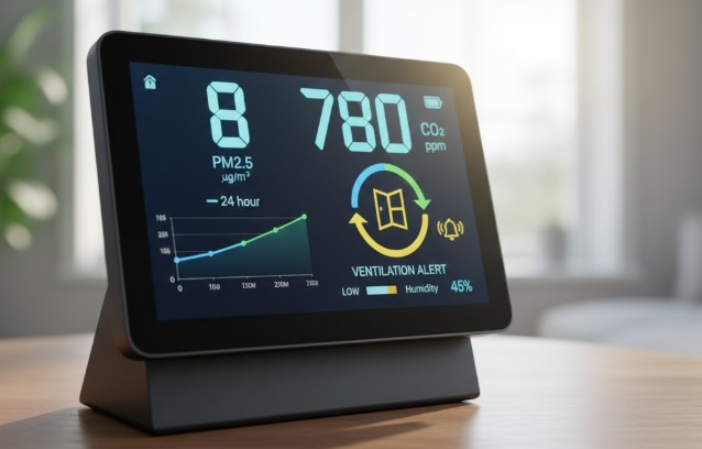 空気清浄機に不満を持つ人の多くが「本当に効いているかわからない」と言いますが、それなら「空気の質を数値化」してしまえばいいのです。最近は数千円から1万円程度で、CO2濃度、PM2.5、揮発性有機化合物(VOC)などを測定できる「空気質モニター(IAQモニター)」が手に入ります。これをリビングに置くだけで、空気が汚れたタイミングが一目でわかるようになります。