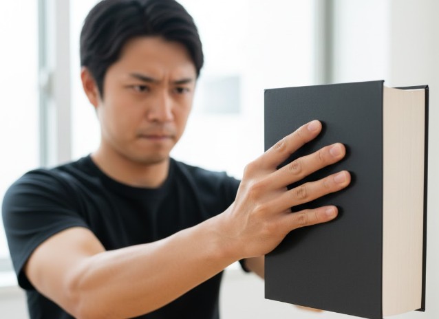 ブックホールドは、辞書のような厚みのある本を指先(第1、第2関節)だけで掴んで持ち上げ、その状態をキープする方法です。これは「静止する力(アイソメトリック)」を鍛えるのに最適で、前腕がじわじわと熱くなるのを感じられるはずです。持ち上げる本の重さや厚さを変えることで、負荷を自由に調整できるのもメリットですね。