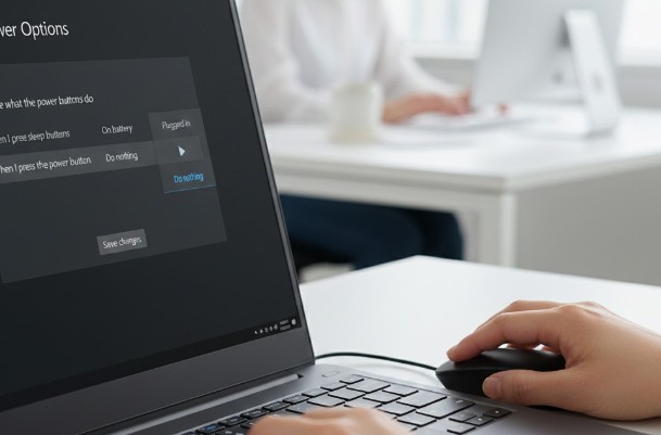 まず、コントロールパネルを開き(検索窓に「control」と打てば出ます)、「ハードウェアとサウンド」>「電源オプション」と進みます。画面左側にある「電源ボタンの動作を選択する」をクリックしてください。ここで、「電源ボタンを押したときの動作」を、バッテリ駆動・電源接続時の両方とも「何もしない」に変更して保存します。これだけで、万が一タイピングミスで電源ボタンを叩いてしまっても、画面が消えたりスリープしたりすることはなくなります。