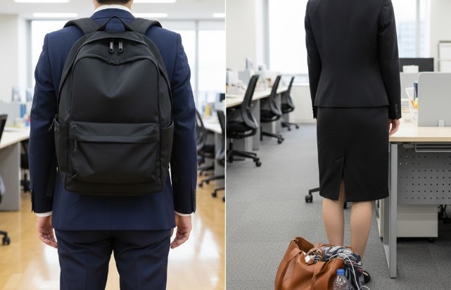 最近はビジネスリュックが市民権を得ていて、街中でも背負っているビジネスパーソンを本当によく見かけますよね。でも、入社式という一生に一度の「儀式」においては、リュックは少し慎重になるべきアイテムなんです。その最大の理由は、せっかくのスーツ姿が台無しになってしまうから。リュックの肩ベルトはスーツの肩パッドを力強く押し潰し、背中全体に深いシワを寄せてしまいます。後ろから見たときに「なんだか学生の延長みたいだな」と思われてしまうのは、少しもったいないですよね。