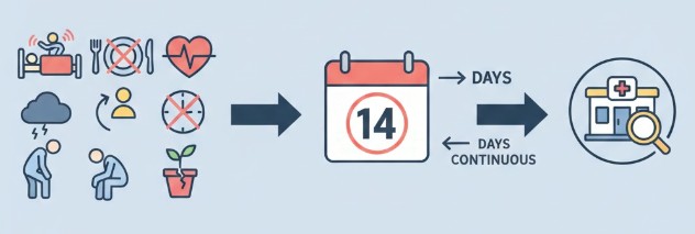 自分がただ疲れているだけなのか、それとも医学的な介入が必要なレベルなのかを判断するのは難しいですよね。一般的に、「2週間以上、ほぼ毎日不調が続いている」場合は、専門家への相談を検討すべきタイミングだと言われています。例えば、これまでは楽しめていた趣味に全く興味が持てなくなったり、休日にしっかり休んだはずなのに月曜日の朝に激しい動悸や吐き気がしたりするのは、脳が「これ以上は無理だよ」とアラートを出している証拠です。放置してしまうと、より深刻な「うつ病」へと進行してしまうリスクもあるため、まずは自分の症状を客観的にチェックしてみてください。